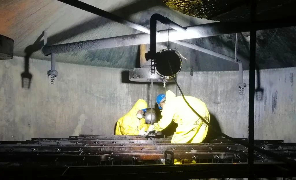 “报告中控,3#电捕绝缘子更换完毕。”7月11日晚23:19分,随着对讲机里传出来的工作报告,陕焦公司黄陵煤化工公司一场长达12小时的紧急抢修战终于顺利完成,3#电捕故障解除。 据了解,陕焦公司黄陵煤化工公司化产车间鼓冷岗位人员在对3#电捕周期性计划吹扫时,发现3#电捕绝缘检测值为0,经再次吹扫依然检测绝缘值为0。随后岗位人员立即将情况汇报给该公司电仪中心电工检修班,随即一场与高温下的“抢修战”拉开了帷幕。 电工维修人员到达现场后,通过对直流升压变压器、3#电捕本体的全面“体检”,未发现故障点,他们初步判断是电捕内电极丝断裂和绝缘子损坏。该中心立即决定进入3#电捕本体内对其进行全面的检查。随后,化产车间与电仪中心相互配合,在最短的时间完成电捕进出口插盲板,开人孔、安装轴流风机置换空气,对空气进行检测,办理受限作业票等各项准备工作。在现场安全措施到位,电工检修人员现场安全交底后,三名维修人员穿上防化服、佩戴防护口罩进入3#电捕开始了大检查,低矮的空间迫使身材高大的几人不得不半蜷缩着身子。而经过高温暴晒的电捕,内部温度达40摄氏度以上,即便在上、下两个人孔,轴流风机的加持下,依然闷热无比,短短的5分钟,检修人员已经是汗流浃背。 “在极热天气进行检修作业时,一定要保证作业人员的安全,增加轮换次数,缩短在电捕内时间,保证人员安全才能保障检修任务保质保量完成。” 该中心党支部书记、主任问俊民将一箱箱水送到检修现场,并再三强调道。 刚从电捕中爬出来的维修工秦少荣,此时汗水布满了他通红的脸颊,被汗水浸湿的上衣紧贴着后背,他伸手接过同事递过来的水,三下五除二喝完,转身又投入到工作中。经过5个小时排查,通过对电极丝及连在一起的4个绝缘子分别拆卸排查,终于发现了故障源,原来是绝缘子瓷瓶中有一个损坏,一个瓷瓶绝缘性不高。经车间讨论决定此次将4个瓷瓶全部更换。 “找到问题所在,接下来更换瓷瓶的工作就好干了……”电工李红伟一边说着,一边与几名同事将1米长的新瓷瓶抬到电捕顶,准备安装作业。晚上的生产现场偶尔吹过一阵凉风,但检修现场的人们却来不及好好感受,抬、拽、拉、扶、换,在大家的默契配合下,终于将绝缘子挂钩连接在电捕上伞架,经过往返4次终于将3#电捕检修完毕。12个小时抢修让大家身心疲惫,但他们毫无怨言,在稍作休息后,快速整理好检修现场,转身迎接下一个工作任务。