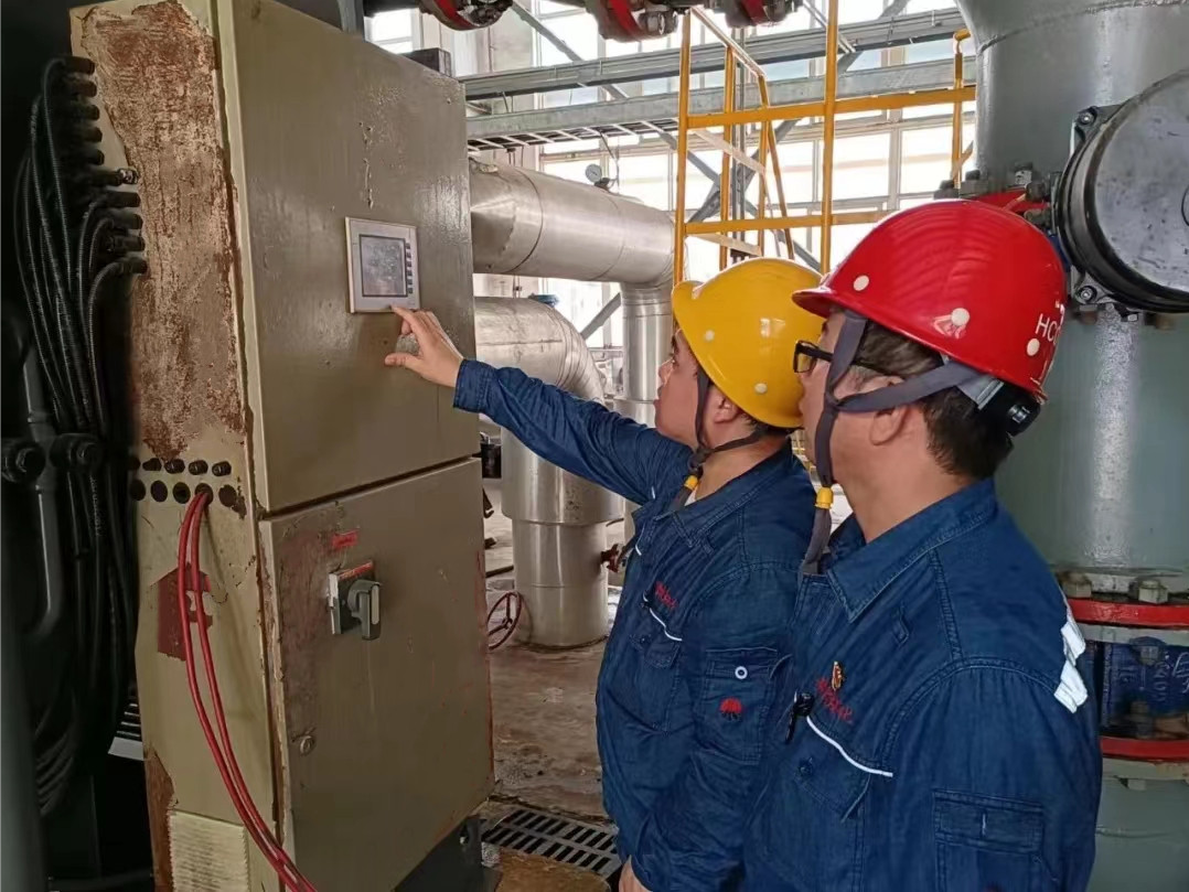 小暑过后,连续高温“蒸煮模式”让人备受煎熬,也让生产设备即将迎来年中“烤验”,为应对高温天气,陕焦公司各生产单位针对夏季高温天气,采取了安全有效的防暑降温措施,提前做好综合性风险预案,筑牢安全红线,做好防范措施,确保设备安稳度夏 。 给电控柜装个“小风扇” 据了解,当室外温度到达38℃的时候,配电室的温度就已经接近50℃左右了,甚至有些隔离开关都已经达到了60℃,极有可能造成隔离开关里边拉簧失效,触点烧坏,严重时会引发火灾,对人员自身安全及设备都会造成不同程度威胁和损失。电控柜如何降温?成为摆在电器工作人员面前的一大难题。 为切实做好电控柜安全运行工作,陕焦公司化产二车间维修班大班长张毅与电工班长张佑民决定给车间循环水1、2、3号电控柜加装散热风扇,以此达到快速降温的目的。说干就干,张佑民带领维修班人员,首先在隔离开关上部搭设绝缘橡胶板隔离带电部件,防止人员触电及工具螺丝掉落,引起电气线路短路事故;接着完成拆除电控柜顶板、开孔打磨、固定风扇、打胶加固等作业;最后,在维修人员“轻、准、稳”的操作下, 3个散热风扇全部安装完成。 “现在,请岗位人员开始送电试验!”随着指令下达,一阵凉风吹过,改造成功了。通过两个小时的观察运行,现场测量隔离开关触点温度30℃,较之前的47℃降低17℃,效果明显。 给现场设备“消消暑” 足蒸暑土气,背灼炎天光。面对炎炎烈日,陕焦公司黄陵煤化工公司化产车间通过及时开启制冷机,投用冷冻水系统,给生产系统消暑降温。据了解,该车间循环水、制冷水、冷冻水系统管线都属地下管网,而且都是DN800以上的大阀门,随着系统的开启必须快速倒换好相应的阀门,这正是此次操作的难点所在。因此,该车间技术员刘刚组织所有人将开机方案进行反复学习,并对注意事项交代了一次又一次,对开机流程演练了一遍又一遍。 在制冷机开机过程中,该车间当班人员盯参数,开阀门,强沟通,齐协作,按照职责分工,保质保量地完成各自工作。横大班长杨刚负责开启冷冻水上水阀门,只见他拿着管钳,穿好雨鞋后上手就开始操作,一圈两圈,随着阀门的快速开启,管道内似乎传来的水流奔腾的欢快声。 “1#制冷机正常,温差8.3摄氏度;2#制冷机正常……”随着对讲机内传来中控的声音,此次工作圆满收官。据了解,冷冻水系统投用后,该车间初冷器、终冷器、换热器等换热效率明显优化。 据悉,针对当前生产设备管理将面临温度高、雷雨多、湿度大等更大更多的挑战,陕焦公司各单位强化设备管理制度,一方面灵活调整设备巡检、养护频次,并通过激励奖励措施,激发全员找隐患,保生产的热情;另一方面紧盯关键工艺指标运行情况,通过精细化操作,确保设备安稳运行。