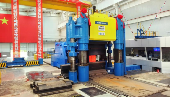 8月22日,行业最大的100MN西马克四柱下拉式快锻机组在天成航材完成首次热试车,成功锻造出一块711*711*1423mm、单重3t的TC4方坯及一块380*1300*2792mm、单重6t的TA3方坯,标志着公司锻造工艺及生产能力迈入全新阶段。 该设备由德国工业巨头西马克集团制造,是目前国内钛合金领域引入的最大、最先进的快锻机组之一。设备总重约2800t,可生产最大长度14000mm,最大宽度4000mm,最大高度4000mm的钛合金锻件。设备自动化程度高、承载能力强,可满足板、饼、棒、环、筒等不同规格、形态的钛合金制备需求,填补我国超大锻件生产技术空白。 万吨西马克快锻机组锻造3t TC4铸锭 万吨西马克快锻机组锻造6t TA3铸锭 万吨西马克快锻机组是天成航材技改三期的重磅设备之一,设备自重大、部件多、安装复杂,且对基建要求极高。天成航材联合中国三安、天津天锻等合作伙伴组成的项目团队通力协作,克服重重困难,于2021年8月启动建设,历时1年完成桩基、土建、安装、试车等所有工作,圆满完成安装任务,再次展现了天成航材高度的凝聚力以及使命必达的“天成速度”。 该设备预计于9月份正式交付生产,投产后不仅可以大幅提升公司工艺水平及技术实现能力,扩充产能,同时也可以解决钛合金产业链超大锻件生产难题,满足国家重大装备、重点型号应用需求,在我国大设备制造以及航空产业中发挥至关重要的作用,为国产钛合金转型升级发展做出更大贡献。