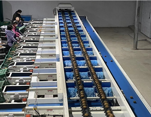 近日,由市农投集团引进的全市首条“猕猴桃智能分选线”落户临渭区程家社区,目前已完成安装调试并正式投入使用。截至目前已向山东、浙江销售猕猴桃近百吨。 在临渭区程家社区猕猴桃智能分选中心,工人们正在将猕猴桃有序放入分选线,从倒果到光电智能分选、再到自动化柔性装框,整套流程一气呵成。以往猕猴桃分选方式全靠人工,果品分选标准不一、效率低下,这条“猕猴桃智能分选线”为光电智能——35米双通道自动化光电智能分选线,通过重量、颜色、果径、果形、表面瑕疵等方面对猕猴桃进行精准分捡,分选速度500个/分钟·通道,可实现6吨/时高效产能,从而严把果子品质,省时省工、降低劳动强度,提高生产效率。 据了解,市农投集团将猕猴桃智能分选中心定址在临渭区程家社区,是为了依托猕猴桃优质核心生产区的地理优势,为猕猴桃品牌化、市场化提供有力保障,满足客户多层次个性化需求,从而弥补猕猴桃产业标准化生产短板,充分发挥国企在供给侧结构性改革中的示范引领作用,进而促进我市猕猴桃产业提档升级、提质增效,在扩大市场影响力和拓宽销售渠道、快速占领市场份额方面起到积极地推动作用。
