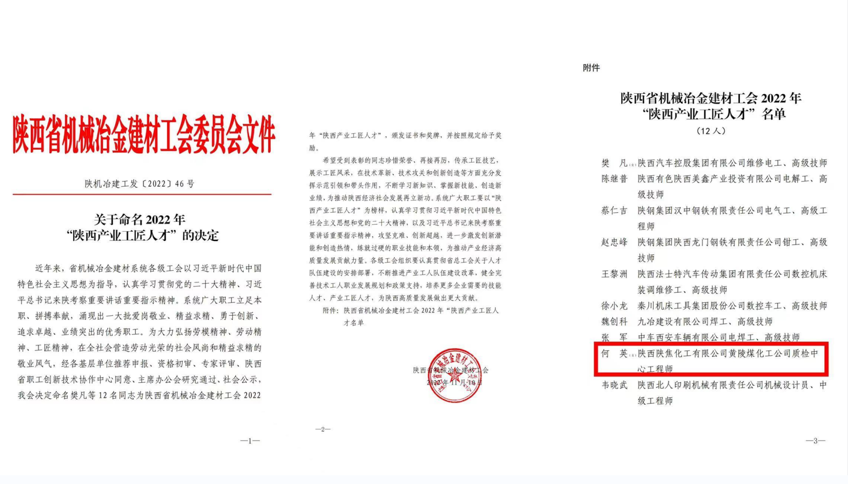 继2020年陕焦公司炼焦一车间副主任王华获“陕西产业工匠人才”荣誉之后,近日,从陕西省机械冶金建材工会又传来喜讯——陕焦公司黄陵煤化工质检中心何英荣获2022年“陕西产业工匠人才”称号。至此,公司已有两人被命名为“陕西产业工匠人才”。 近年来,该公司坚持培育创新型、技能型人才,以工匠精神为引领,积极开展技能提升培训、岗位练兵,技术比武等活动,全面提升技能人才素质工程,将工匠精神融入公司转型发展的长期战略规划进程中,倡导职工树立敢想敢干的敬业精神、务实担当的创新精神、攻坚克难的奉献精神,一大批技艺精湛的“技术状元”“技术能手”“技术标兵”,脱颖而出,引领带动广大职工踊跃投身到技能提升的火热实践中,为推动公司转型发展做出了积极贡献。 据了解,陕西产业工匠人才是省总工会实施的人才建设工程,由陕西省机械冶金建材工会联合省职工创新技术协作中心评选授予,每两年评选一次,旨在弘扬劳模精神、劳动精神、工匠精神,充分发挥劳模和工匠人才的示范引领作用,表彰优秀工匠人才。按照《陕西产业工匠培育计划》,陕西产业工匠人才由省级产业工会给予专项奖励,用于其开展技术革新、技术攻关等活动,以此激发人才创新潜能和创造热情,对于加快推进陕西产业工人队伍建设改革发展、发扬爱岗敬业和创新创造劳动精神有着重要意义。 此项荣誉的获得,不仅展现了陕焦公司职工立足岗位成才,全身心投身化工事业奋勇争先的主人翁精神、精益求精的敬业奉献精神,还体现了该公司在技能型人才培养方面做出的努力。
