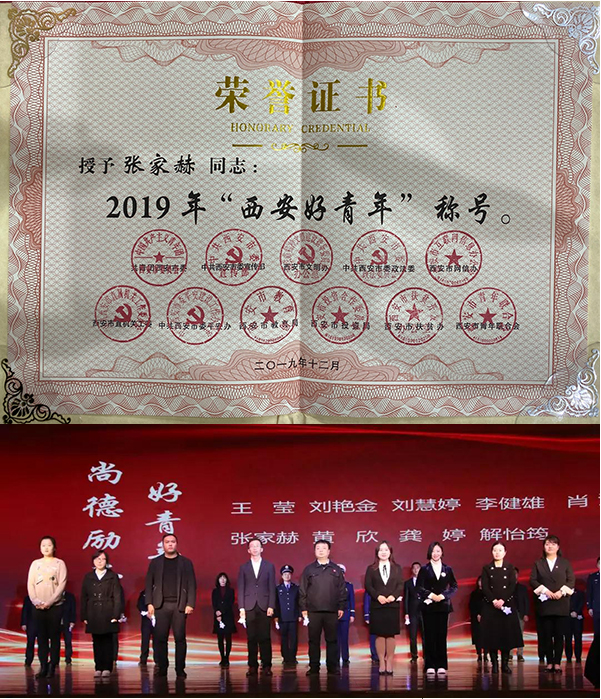 12月18日,由共青团西安市委、西安市委宣传部(市委文明办)、市委政法委、市委网信办等11家单位共同主办的2019年“‘青春心向党 建功新时代’--西安好青年”发布仪式在西咸新区秦汉中学举行,现场发布了2019年“西安好青年”个人(集体)及第三届西安市“十大杰出好青年”等获奖结果,并进行了现场表彰。共青团陕西省委副书记王惠,共青团西安市委书记、党组书记汪国栋,市委宣传部副巡视员陈永利等领导出席活动。来自西安市各行各业的青年代表等共计500余人共同见证了此次颁奖典礼。 作为西安市青年的优秀代表,我会员工张家赫同志荣获2019年“西安好青年”荣誉称号,他用实际行动践行了社会主义核心价值观,传递了青春正能量,充分展现了西安好青年积极向上、向善、向美和为梦想奋斗的时代特征,尤其是其见义勇为、正气昂然的道德风范及与不法分子勇于搏斗的无畏精神,更是体现了“西安好青年·尚德励志好青年”政治进步、品德高尚、贡献突出的鲜明特点,是全市青年学习的好榜样。 作为张家赫同志的工作单位,陕西省企业家协会对张家赫同志荣获“西安好青年”荣誉称号予以高度肯定和赞誉,并要求协会全体党员及青年干部、员工向其学习,为陕西发展贡献自己的青春、智慧和力量。