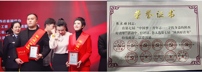 2020年1月13日,由团省委、省青联联合省委宣传部、省委政法委、省委网信办、省委文明办、省委直属机关工委、省国资委、省委教育工委、省委军民融合办、省委科技工委11家单位共同主办的“青春心向党,建功新时代”暨第七届“‘中国梦·青年志’——寻找身边的陕西好青年”颁奖典礼在西安航天会议中心举行。