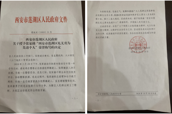 2018年10月10日,西安市莲湖区人民政府授予张家赫同志“西安市莲湖区见义勇为先进个人”荣誉称号,并在陕西省企业家协会举行了表彰仪式。我会常务副会长兼秘书长段克明、驻会副会长李西人、莲湖区综治办调研员查申、莲湖区环城西路街道党工委副书记高帜、莲湖区环城西路街道综治办副主任金伟等十余名同志参加了仪式。 首先,查申副处长通报了张家赫同志见义勇为的事迹,宣读了《西安市莲湖区人民政府关于授予张家赫“西安市莲湖区见义勇为先进个人”荣誉称号的决定》,颁发荣誉证书及一万元奖金。并对张家赫同志2018年6月在由西安市文明办、华商报、华润置地联合发起“寻找最美西安人”活动中获得“最美西安人”荣誉称号表示祝贺! “路见不平一声吼,该出手时就出手”,高帜副书记对张家赫同志在关键时刻奋不顾身的精神给予了充分的肯定和赞扬,并表示张家赫就是我们的楷模,人民的英雄,鼓舞和激励广大人民群众同各种违法犯罪行为做斗争,弘扬社会主义正气。 最后段克明副会长对莲湖区人民政府的工作人员表示感谢,代表张家赫同志为莲湖区环西路综治办副主任金伟同志赠送“热情服务 廉明高效”锦旗。并强调作为年轻人要有担当精神,有责任意识,要充满正能量,张家赫同志的行为弘扬了我会优良文化,自觉践行社会主义的核心价值观,正能量就在我们身边,号召大家认真学习其见义勇为的先进事迹。 会场掌声不断,每个参会代表都为张家赫同志称赞并与英雄合影留念。
