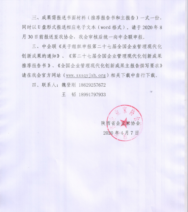 各地市协会、各有关企业: 为深入贯彻落实习近平新时代中国特色社会主义思想和党的十九大精神,全面贯彻新发展理念,切实推进管理创新,加快企业高质量发展,根据中企联《关于组织申报第二十七届全国企业管理现代化创新成果的通知》要求,我会将组织申报第二十七届全国企业管理现代化创新成果,现将有关事项通知如下: 一、本届创新成果应当结合当前经济社会发展形势和抗击新冠肺炎疫情、复工复产情况,突出以下重点:战略转型与新业态新模式培育、“智能+”与数字化发展、复工复产与稳定劳动关系、国有企业改革与混合所有制发展、产业链协作与网络化整合、集团管控与组织变革、技术创新与技术改造、精益管理与标准化建设、质量提升与品牌建设、财务管理与风险控制、“一带一路”建设与国际化经营、人力资源管理与激励机制、绿色发展与社会责任管理等。 二、自愿申报。除“抗疫复产”经验外,截止2020年6月30日必须实施满一年以上。 三、成果需报送书面材料(推荐报告书和主报告)一式一份,同时以U盘形式报送相应电子文本(word格式)。请于2020年8月30日前报送至我协会,我会审核后统一向中企联申报。 三、中企联《关于组织申报第二十七届全国企业管理现代化创新成果的通知》、《第二十七届全国企业管理现代化创新成果推荐报告书 》、《全国企业管理现代化创新成果主报告撰写要求》请在我会官方网站(www.sxsqyjxh.org)相关下载中自行下载。 四、联系人:魏登刚 18629257672 王 韬 18991797933 陕西省企业家协会 2020年4月7日 附关于组织申报第二十七届全国企业管理现代化创新成果的通知:相关附件下载 附第二十七届全国企业管理现代化创新成果推荐报告书:相关附件下载