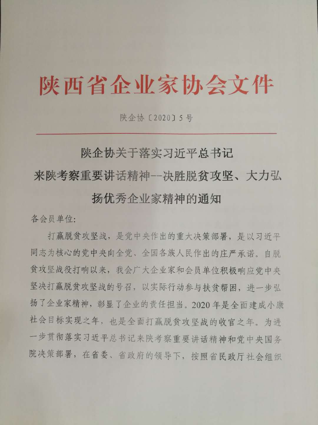 陕西省企业家协会关于落实习近平总书记 来陕考察重要讲话精神--决胜脱贫攻坚、大力弘扬优秀企业家精神的通知