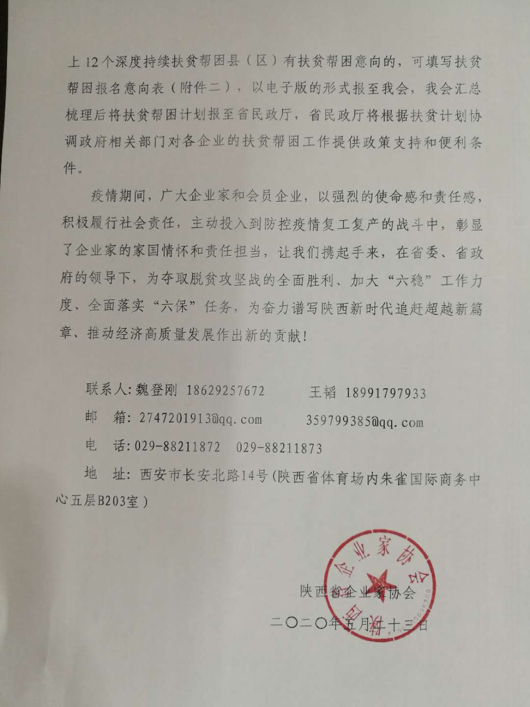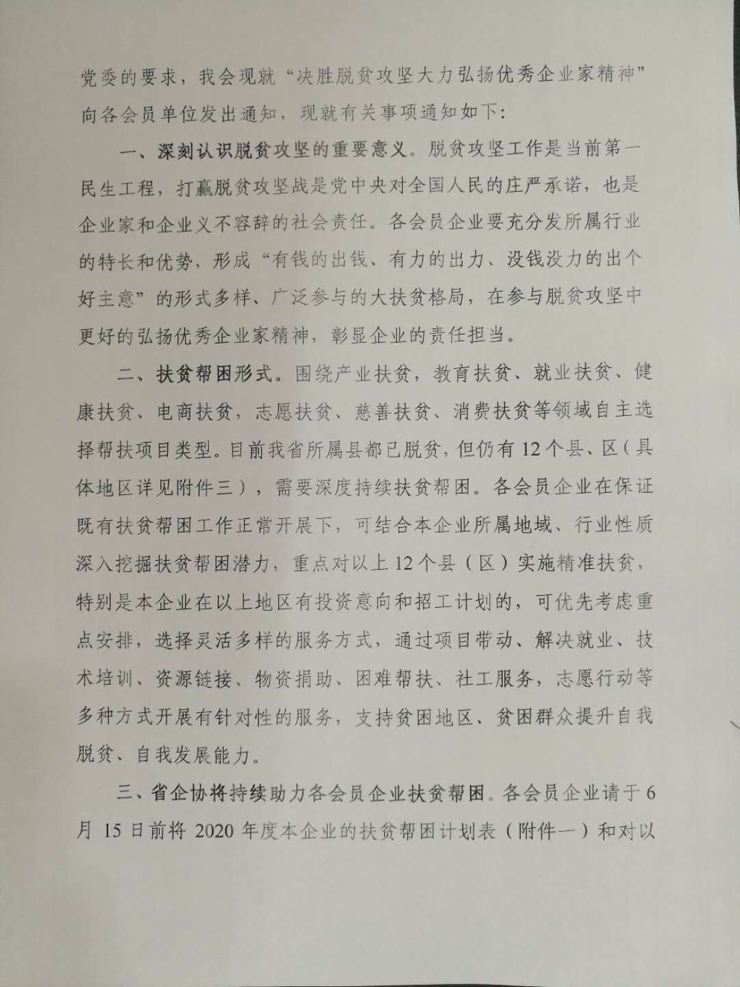 打赢脱贫攻坚战,是党中央作出的重大决策部署是以习近平同志为核心的党中央向全党、全国各族人民作出的庄严承诺。自脱贫攻坚战役打响以来,我会广大企业家和会员单位积极响应党中央坚决打赢脱贫攻坚战的号召,以实际行动参与扶贫帮困,进一步弘扬了企业家精神,彰显了企业的责任担当。2020年是全面建成小康社会目标实现之年,也是全面打赢脱贫攻坚战收官之年。为进一步贯彻落实习近平总书记来陕考察重要讲话精神和党中央国务院决策部署,在省委、省政府的领导下,按照省民政厅社会组织党委的要求,我会现就“决胜脱贫攻坚大力弘扬优秀企业家精神”向各会员单位发出通知,现就有关事项通知如下: