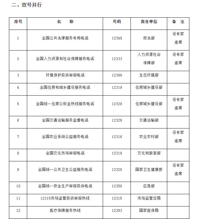 2.双号并行。话务量大、社会知晓度高的政务服务便民热线,保留号码,将话务座席并入12345热线统一管理。对于不具备归并条件的热线,可以保留话务座席,与12345热线建立电话转接机制,按照12345热线标准统一提供服务,具体由各地区根据实际情况决定。热线号码在一些地区已经取消的,原则上不再恢复。