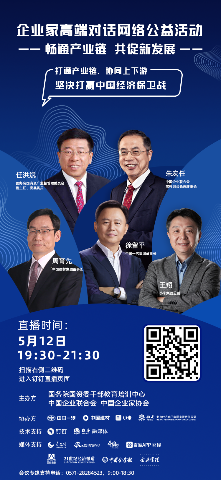 各有关企业: 为贯彻习近平总书记关于统筹推进新冠肺炎疫情防控和经济社会发展工作的重要讲话精神和党中央、国务院系列部署要求,积极推动企业复产达产,稳定产业链供应链,使企业转危为机,实现共同发展。我会与国务院国资委干教中心定于5月12日晚19:30-21:30举办第二期“企业家高端对话网络公益活动”。任洪斌副主任将出席会议并讲话。我会常务副会长兼理事长朱宏任担任主持人,中国第一汽车集团有限公司董事长徐留平、中国建材集团有限公司董事长周育先、小米科技有限公司总裁王翔为发言嘉宾。 会议将聚焦“畅通产业链共促新发展”的主题,围绕大企业如何发挥龙头作用,快速打通产业链供应链,稳住我国经济发展基本盘,维持产业链的完整性和全面性,保障全面复工达产;同时加大核心技术研发力度,提高供应链流程数字化管理能力,打造更强创新力、更高附加值的供应链、产业链;维护国际供应链稳定,保证我国产业链安全。欢迎贵企业组织本企业员工观看!未下载钉钉请先下载,然后保存下方二维码图片,进入钉钉扫描二维码图片报名,5月12日19:30正式收看。 2020年5月6日